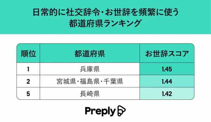 ※『社交辞令がもっとも得意な都道府県ランキング(https://preply.com/ja/)』は、マンツーマンのオンライン英語レッスン Preply調べです。