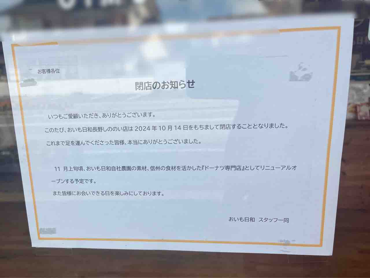 『おいも日和』は、10月14日をもって閉店。
